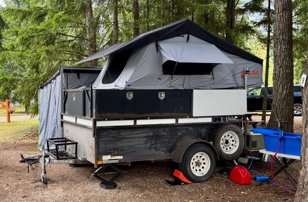 The trailer I have had since my contracting days. A 6x10ft utility trailer with tool boxes mounted on the top rails. The RTT we found on Facebook Marketplace. I used an old set of camper steps instead of a ladder to access the tent off the back tailgate of the trailer. (A, doesn’t do ladders) The awning and annex came with the RTT, makes a nice place to keep our clothes and food stuffs. Some stabilizers to keep it all steady, and a fair bit of electrical to keep up powered up.